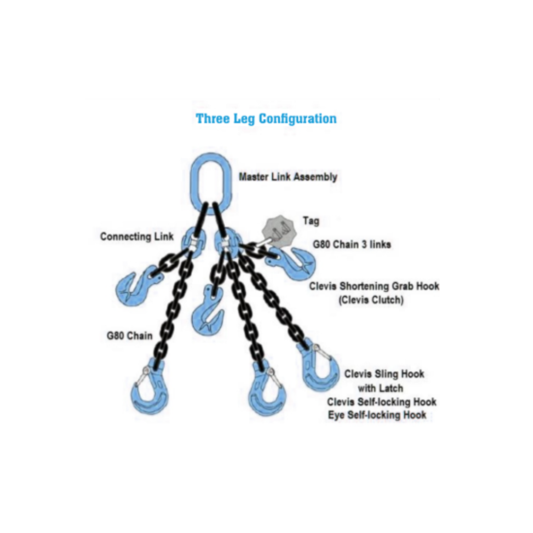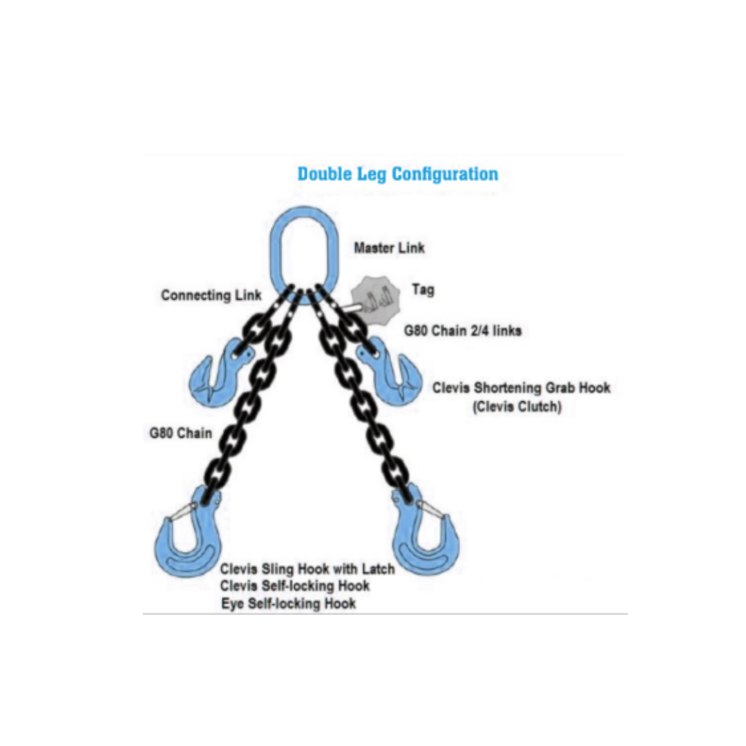 Available in single leg, double leg, three-leg, and four-leg configurations, the Chain Sling provides flexibility to meet different load requirements. It is equipped with G80 master links, clevis grab hooks, self-locking hooks, and connecting links, allowing for a wide range of rigging and lifting applications.